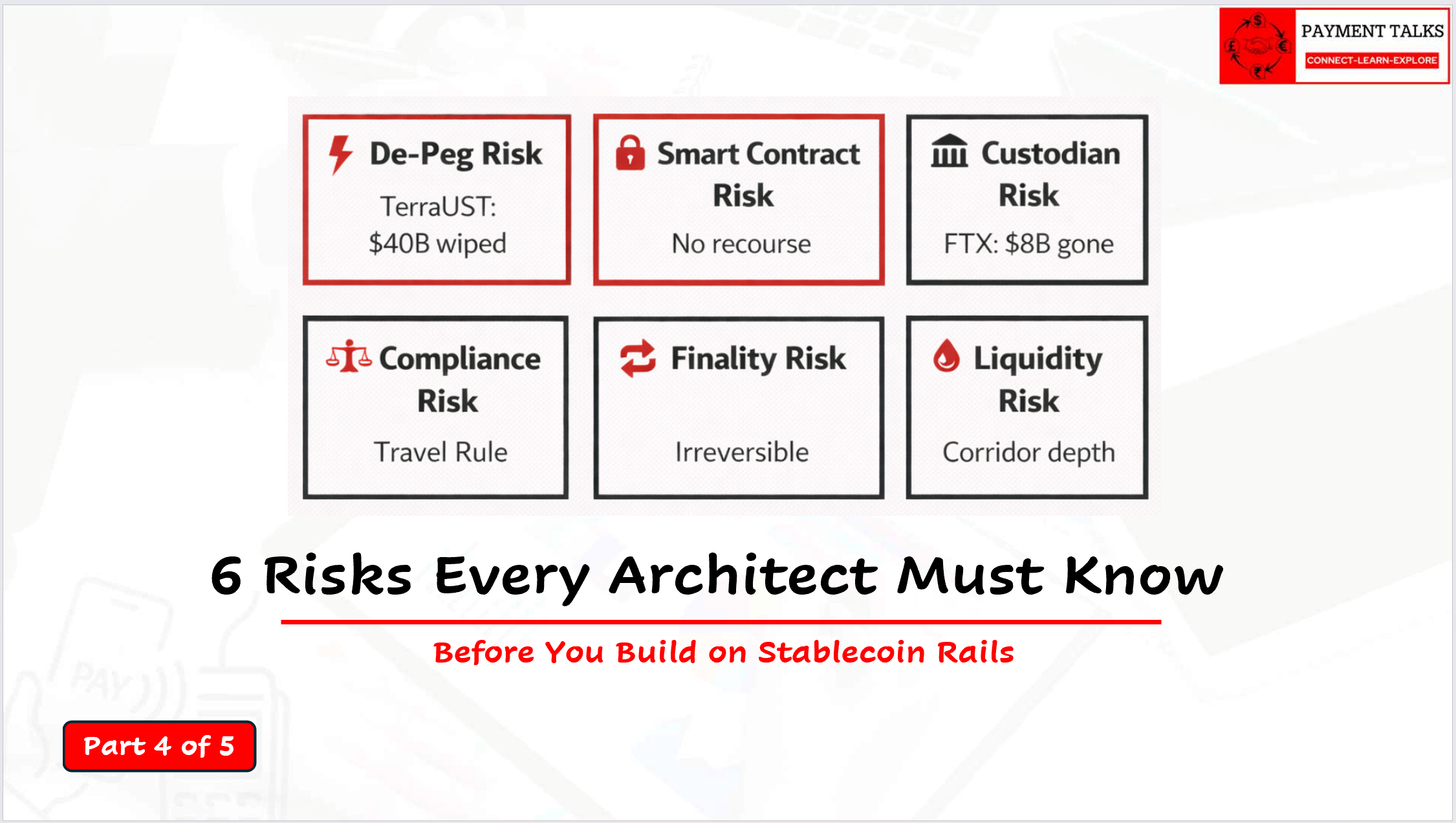 Explainer Videos Detailed Explanation of Agents and Parties in an ISO 20022 Message – Part 3 – Additional Agents – Explainer Video RAVI January 8, 2025 0 Read More Understanding Correspondent Banking: A Comprehensive Guide – Explainer Video RAVI January 15, 2025 0 Read More Detailed Explanation of Agents and Parties in an ISO 20022 Message – Part 2 – Payment Processing – Explainer Video RAVI January 8, 2025 0 Read More DPD & CPD – Part 1: Debit Party Derivation for Outgoing Payments – Explainer Video RAVI April 1, 2025 0 Read More What is a payment, its brief evolution and key elements in Domestic and International payments – Explainer Video RAVI December 31, 2024 0 Read More Detailed Explanation of Agents and Parties in an ISO 20022 Message – Part 1 – Payment Initiation – Explainer Video RAVI January 8, 2025 0 Read More DPD & CPD – Part 2: Debit Party Derivation for Incoming & Onward Payments – Explainer Video RAVI April 8, 2025 0 Read More Nostro, Mirror Nostro, Vostro, and Loro Accounts: A Comprehensive Guide – Explainer Video RAVI January 29, 2025 0 Read More Demystifying SWIFT Charge Codes: OUR/DEBT, BEN/CRED and SHA/SHAR – Explainer Video RAVI February 18, 2025 0 Read More DPD & CPD – Part 3: Credit Party Derivation for Outgoing Payments – Explainer Video RAVI April 14, 2025 0 Read More DPD & CPD – Part 4: Credit Party Derivation for Incoming and Onward Payments – Explainer Video RAVI April 22, 2025 0 Read More Payment Topics Stablecoin Risks and Regulation: What Every Payments Architect Must Know Before Building – Part 4 of 5 RAVI March 30, 2026 0 Read More Stablecoins vs Traditional Payment Rails: Same Payment, Two Very Different Journeys – Part 3 of 5 RAVI March 30, 2026 0 Read More How Stablecoins Are Created and Destroyed: The Complete Mechanics Guide – Part 2 of 5 RAVI March 30, 2026 0 Read More What Is a Stablecoin? A Payments Professional’s Complete Introduction – Part 1 of 5 RAVI March 30, 2026 0 Read More PAIN.001 Fields Explained — A Complete Guide to Customer Credit Transfer Initiation RAVI March 26, 2026 0 Read More MT101 Message Fields Explained — With PAIN.001 Mapping (Field-by-Field Guide) RAVI March 2, 2026 0 Read More Understanding MT Field Formats | SWIFT MT Message Basics Explained RAVI February 22, 2026 0 Read More Overview of MT Message Blocks RAVI February 22, 2026 0 Read More PAIN.001 Structure Explained — Architecture, Bulk Logic, and Comparison with MT101 RAVI February 7, 2026 0 Read More What Is PAIN.001? | ISO 20022 Payment Initiation Flows Explained with Real Examples RAVI January 21, 2026 0 Read More Unstructured, Structured, and Hybrid Postal Addresses in ISO 20022 RAVI January 13, 2026 0 Read More ISO 20022 Business Application Header (BAH) – A Complete, Structured, and Practical Guide RAVI December 16, 2025 0 Read More Understanding the Building Blocks of ISO 20022 RAVI December 5, 2025 0 Read More Fundamentals of ISO20022 RAVI November 23, 2025 0 Read More Double-Entry Accounting in Payments: The Foundation of Financial Integrity in Banking RAVI November 15, 2025 0 Read More Payment Life Cycle – Banking Transaction RAVI November 8, 2025 0 Read More Debit – Credit Party Derivation for Incoming, Onward and Outgoing Payments in Payment Engine RAVI April 1, 2025 0 Read More Understanding Charge Codes in SWIFT Payments: OUR/DEBT, BEN/CRED, and SHA/SHAR RAVI February 18, 2025 0 Read More Nostro, Mirror Nostro, Vostro, and Loro Accounts: A Comprehensive Guide RAVI January 29, 2025 0 Read More Understanding Correspondent Banking: A Comprehensive Guide RAVI January 15, 2025 0 Read More Detailed Explanation of ALL Agents and Parties involved in an ISO Payment Message RAVI January 5, 2025 0 Read More What is a payment, its brief evolution and key elements in domestic and international payments. RAVI December 31, 2024 0 Read More Domestic Payment Processing Methods RAVI December 4, 2024 0 Read More