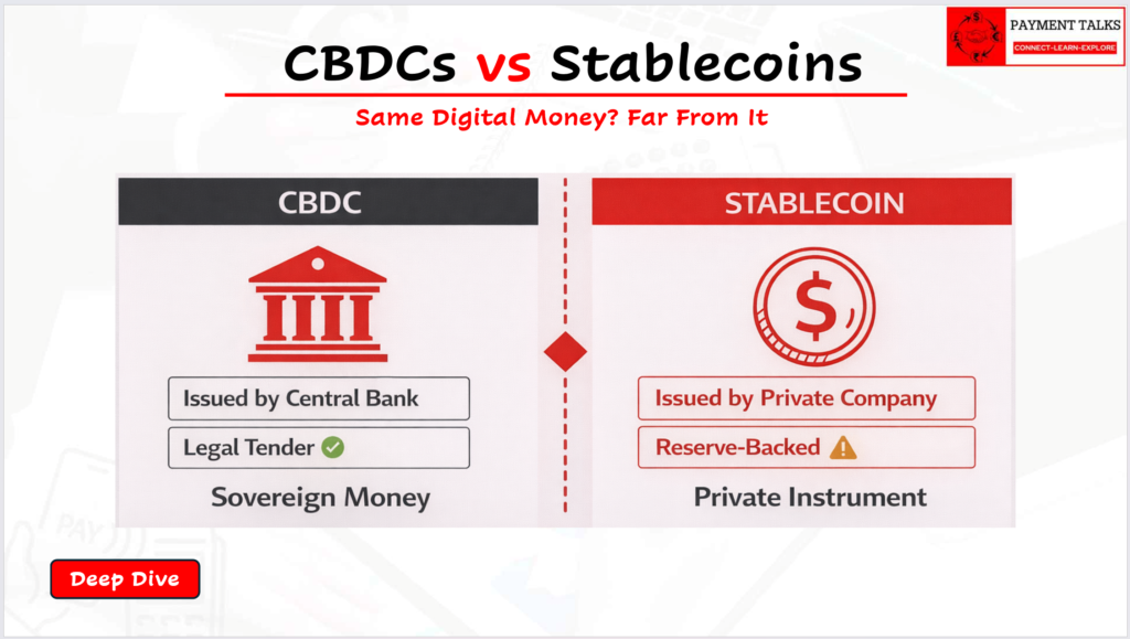 A colleague stops you in the corridor. “We just got a briefing from the central bank. They want us to assess readiness for a retail CBDC pilot.” You nod confidently. But on the way back to your desk, the question surfaces: is a CBDC just a stablecoin issued by a government? What is actually different?