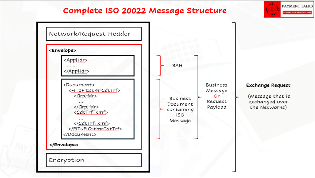| Layer | Inside ISO message (<Document>) | Outside ISO message as <Envelope> header |