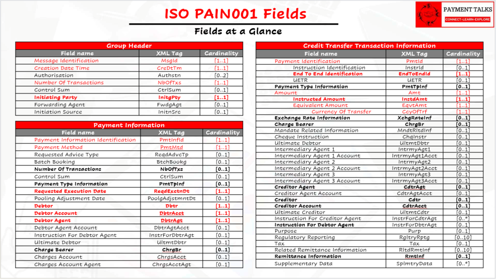 Imagine you are a corporate treasurer sitting in Frankfurt. You need to pay a supplier in Singapore, settle an invoice with a vendor in New York, and transfer funds to a subsidiary in Dubai — all before end of business today. You log into your ERP system, create a single payment file, and send it to your bank. That file is a PAIN.001 — Customer Credit Transfer Initiation message. And every payment instruction inside it is governed by a precise set of fields that tell your bank exactly what to do.