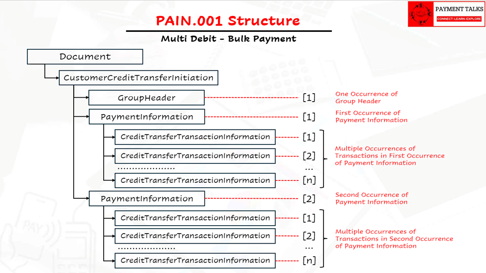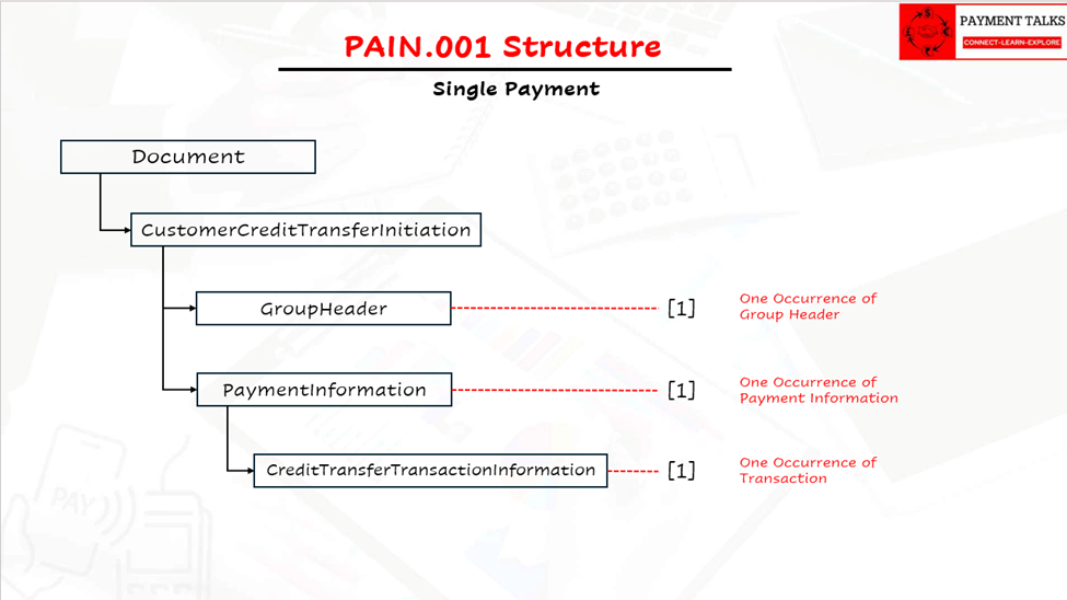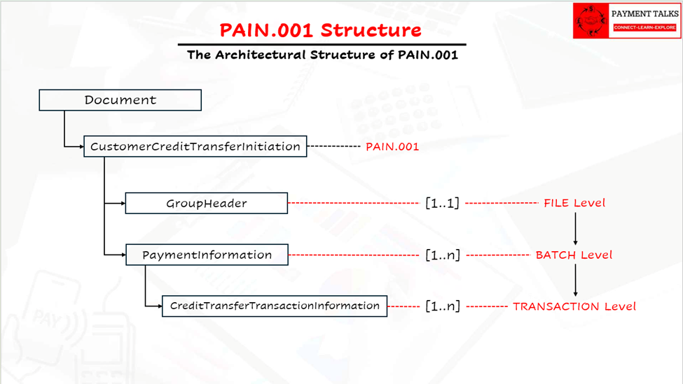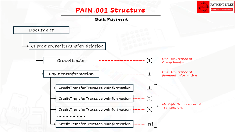 - PAIN.001: 1 GrpHdr (Never Repeats) → n * PmtInf → m * CdtTrfTxInf (in each PmtInf)