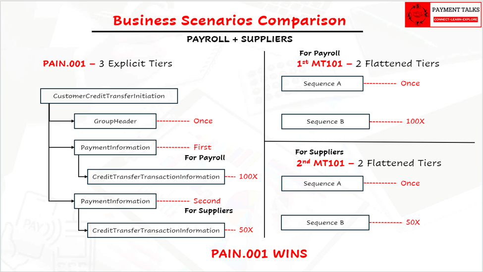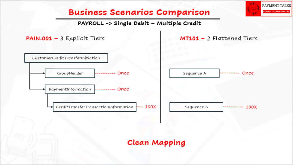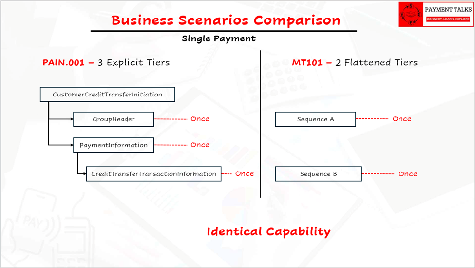 MT101 is structurally flat and interpretation-based, while PAIN.001 is hierarchical and explicitly modeled.