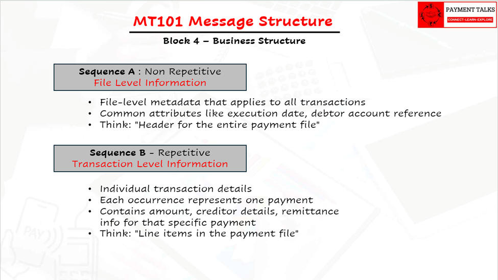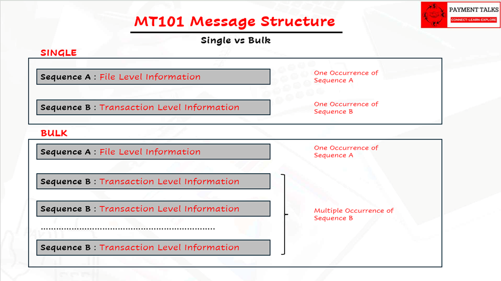 MT101 = One File Header (Seq A) + Multiple Transactions (Seq B)