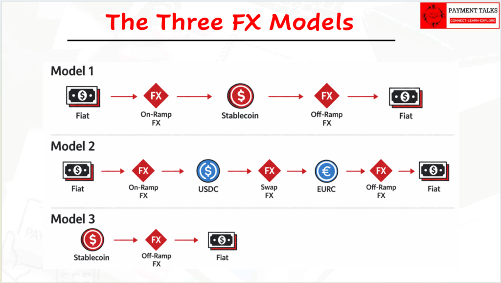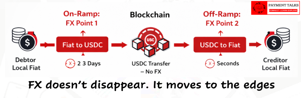 This is the concept that every payments professional must internalise before anything else. Stablecoins do not eliminate FX. They move it to the edges of the payment flow.