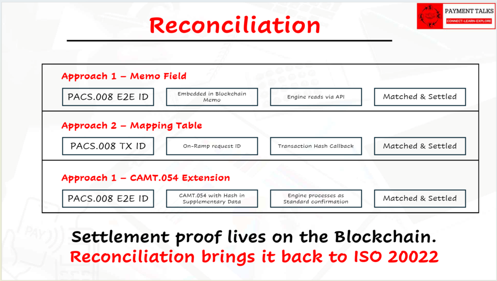 • Reconciliation bridges ISO 20022 references to on-chain transaction hashes — via memo fields, mapping tables, or CAMT.054 extensions.