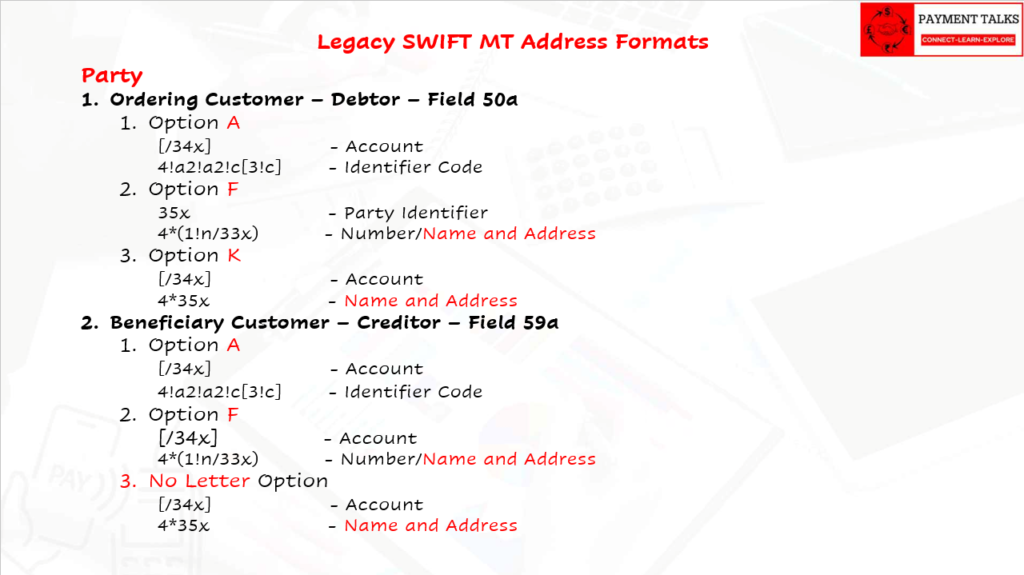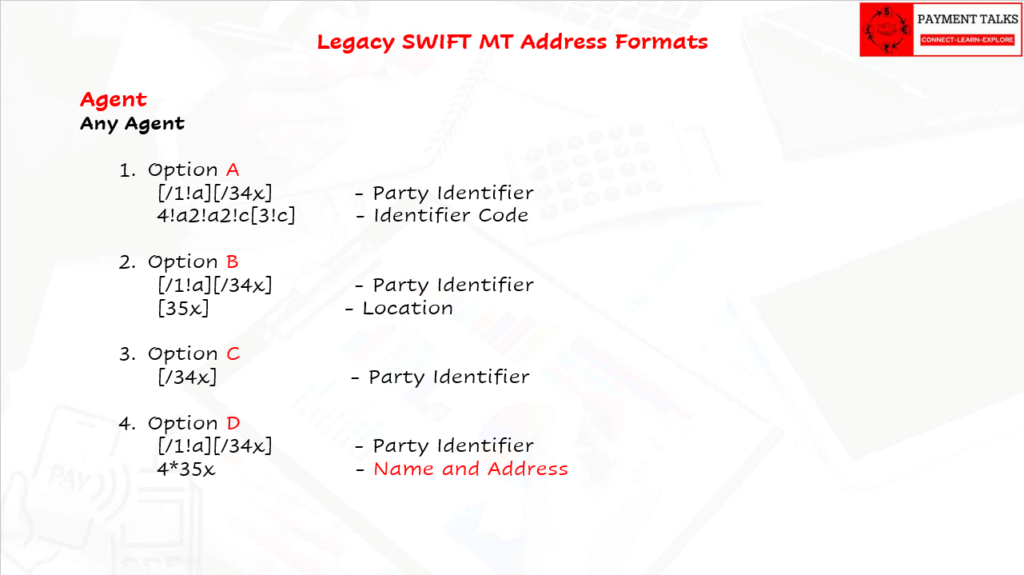 This mirrors legacy SWIFT MT usage, where address information was embedded in: