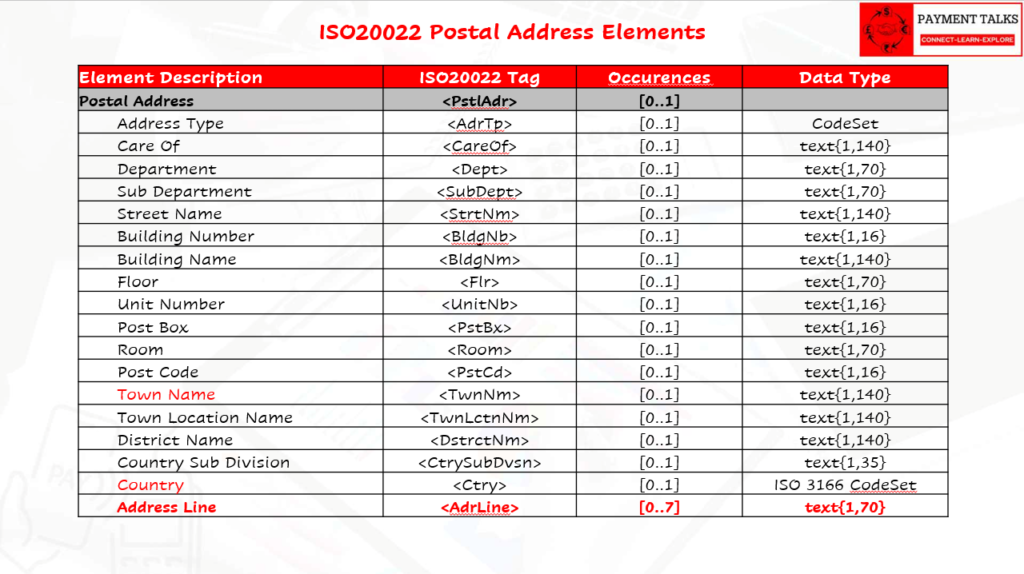 - Each Scheme may have their own restrictions or usage guidelines on top of this base ISO Structure. For Example, CBPR does not allow Elements like CareOf, UnitNb, AdrTp, etc. Also, the Address Line Occurrences is limited to 2 or 3 based on Address Format.