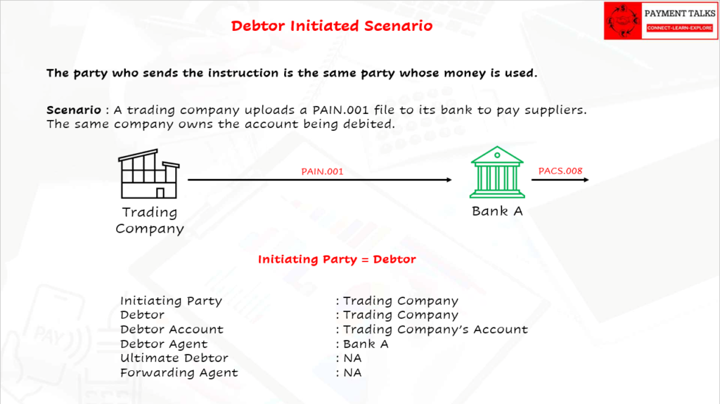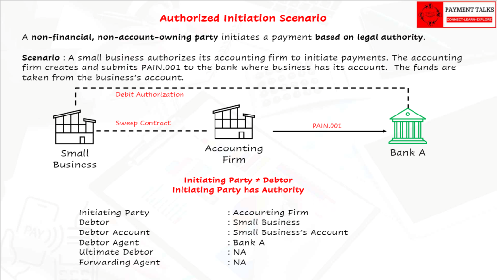 | Initiating Party (InitgPty) | The party that creates, authorizes, and takes responsibility for the instruction |