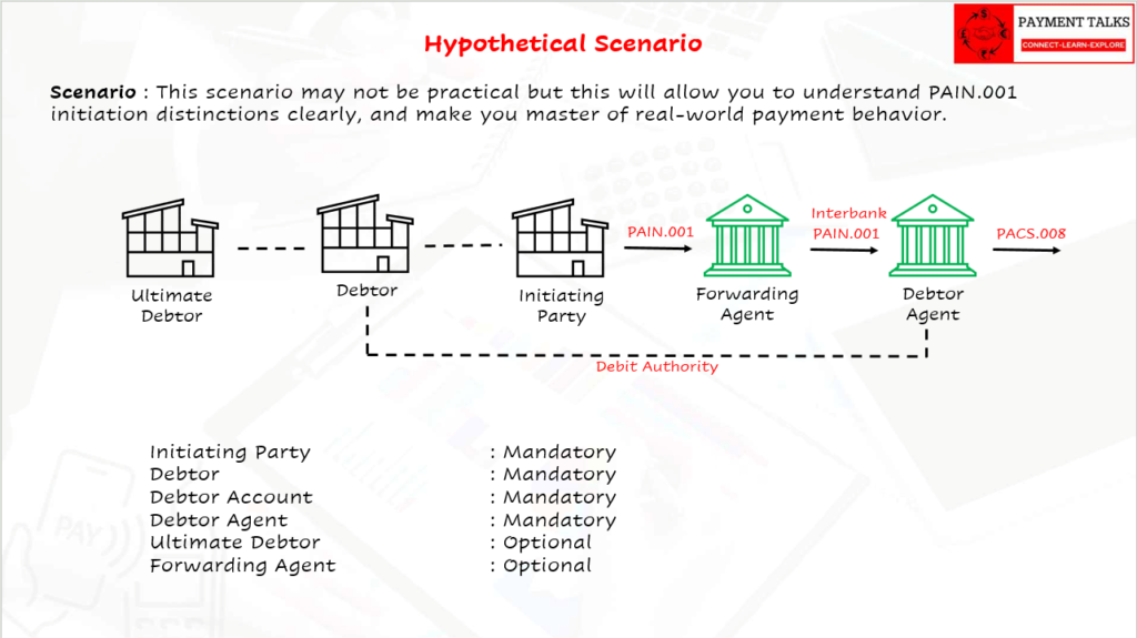 PAIN.001 initiation scenarios exist because authority, money, connectivity, and economic ownership do not always sit with the same party.